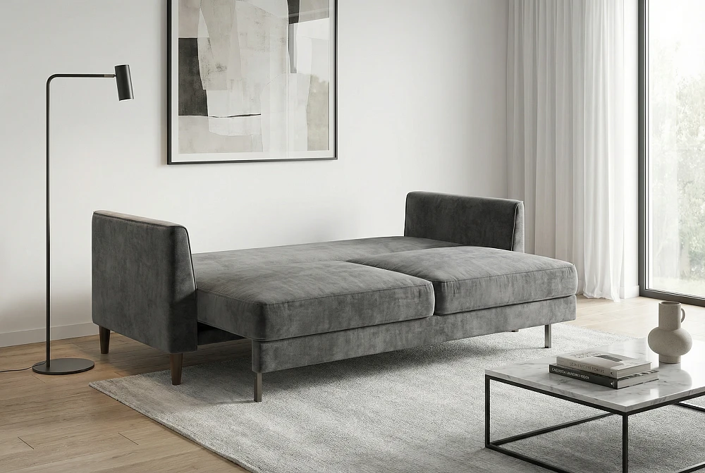 Диван сочетает простоту линий и мягкость форм, создавая гармонию между строгостью и теплом.