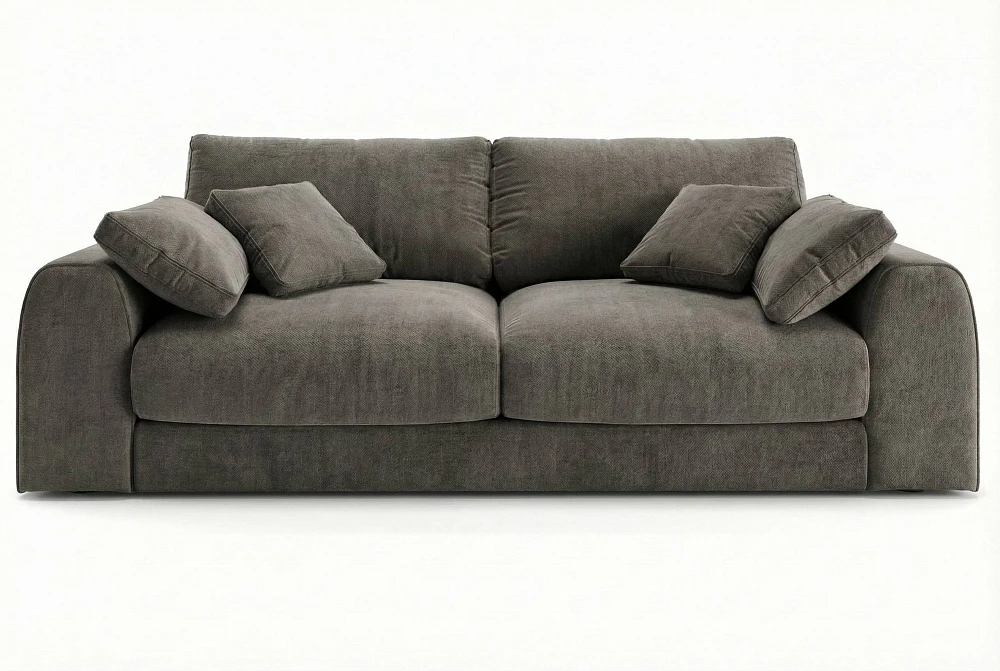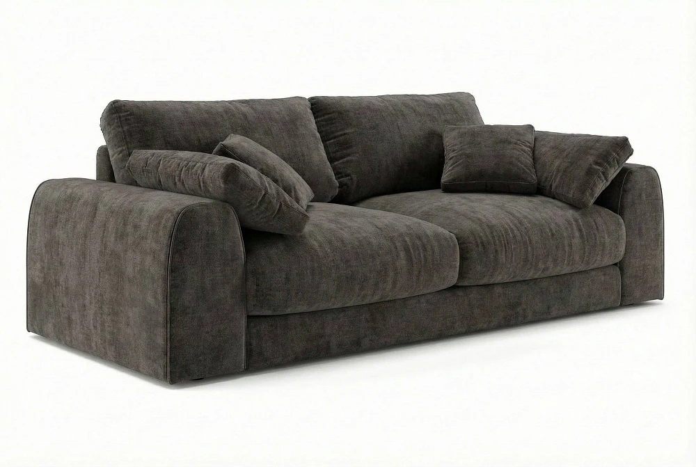 Лаконичные линии и объёмные формы создают гармоничный силуэт, а аккуратный кант по подлокотникам и декоративным подушкам подчеркивает плавность дизайна.