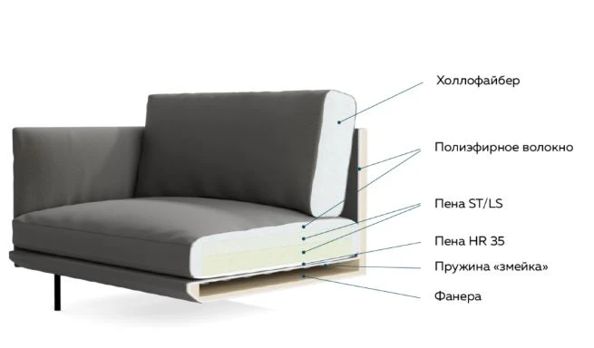 Подлокотник: Пена HR 25 кг, ширина — 23 см. Фиксированные подушки спинки.