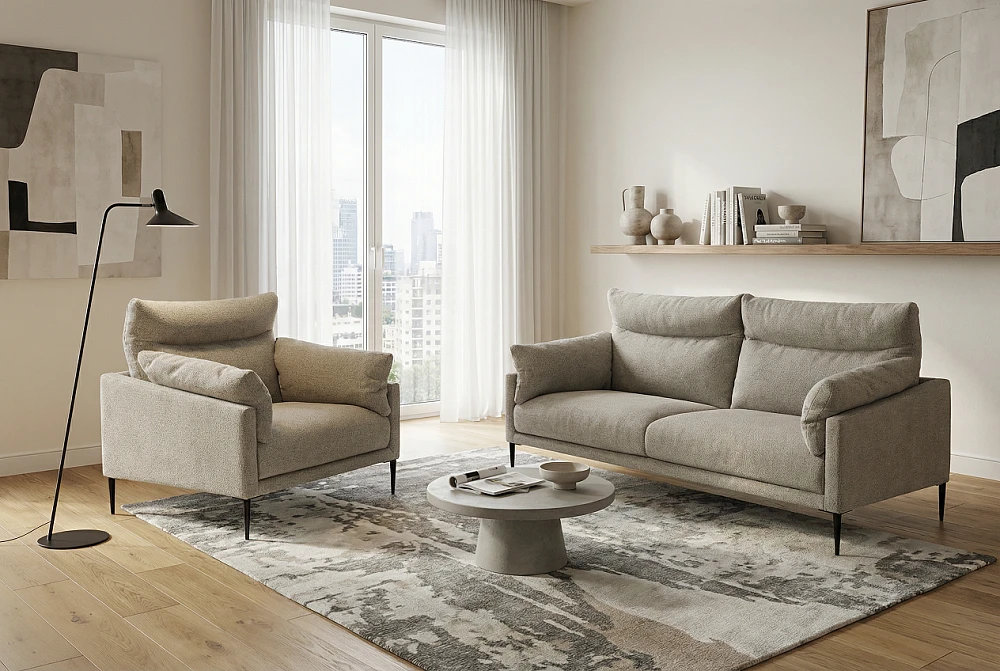 Выбирайте модели на высоких ножках или с узкими подлокотниками — они “облегчают” пространство и визуально добавляют воздуха.