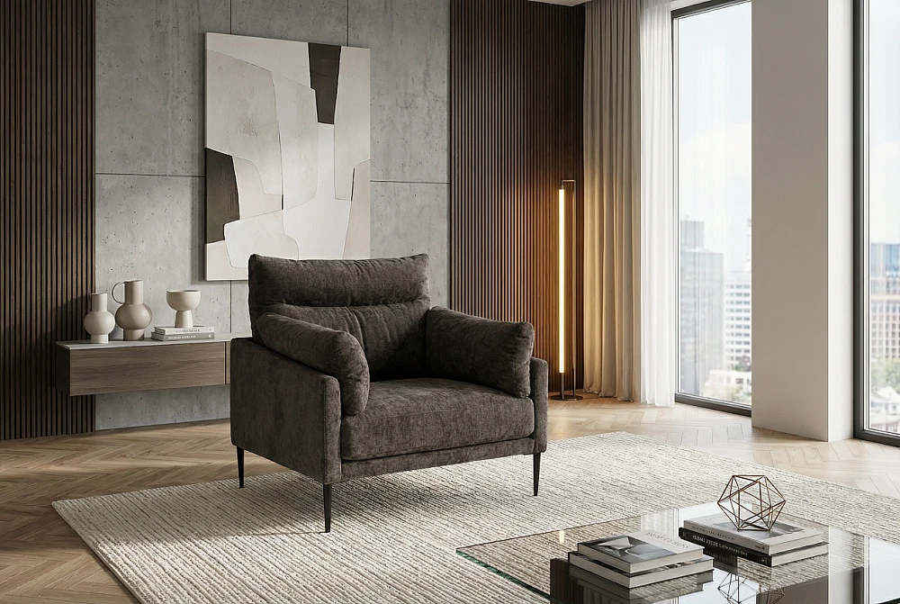 Модель может использоваться в индивидуальном формате, в составе гарнитура с прямым или угловым диваном, комбинироваться с большинством коллекций и обустраивать интерьеры от трендового ваби саби до аскетичного лофт.