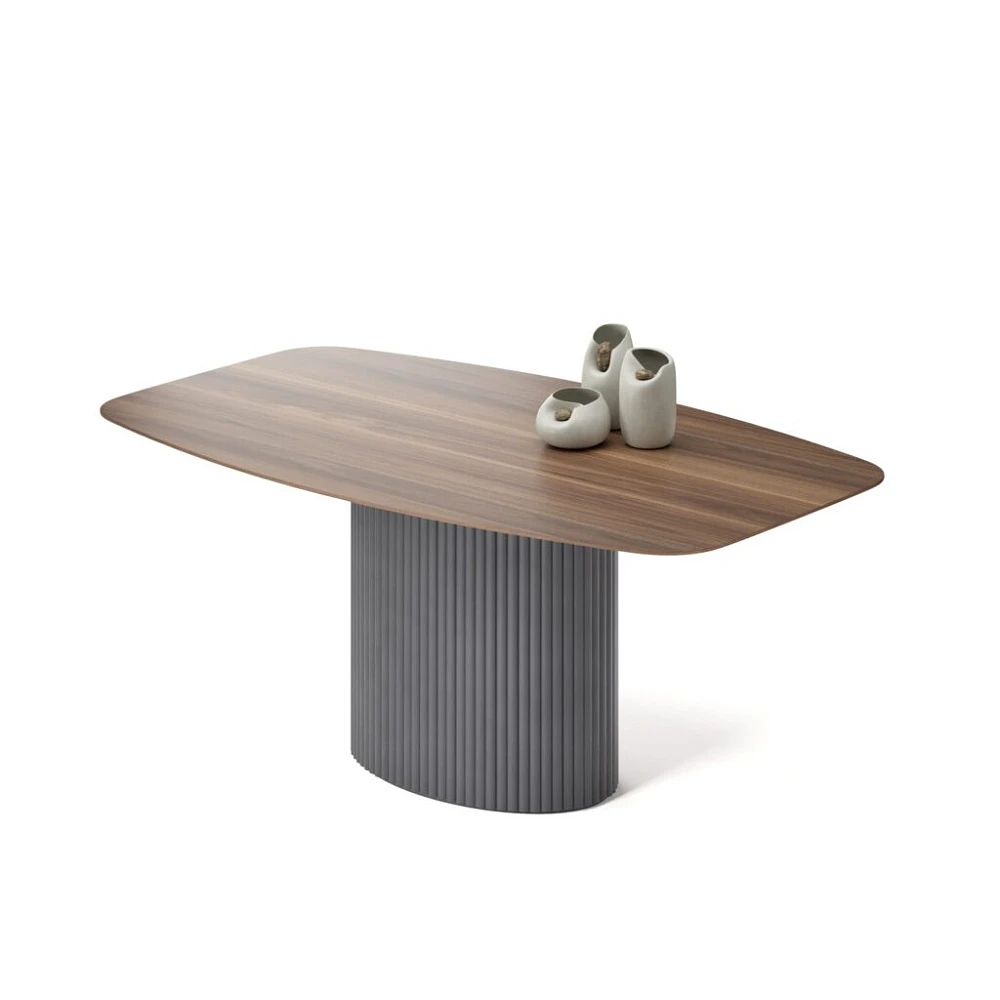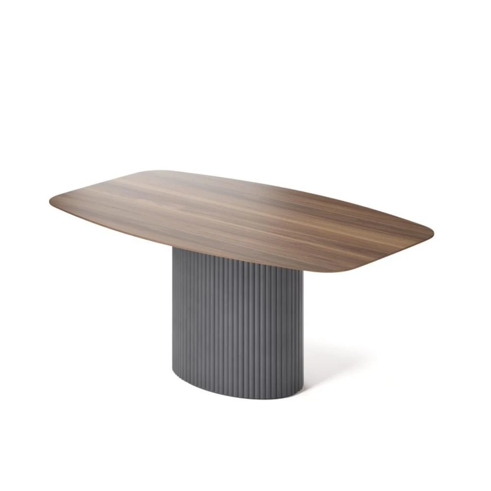Столешница 1800х1100 выполнена выполнена из МДФ со скошенной кромкой. Это позволяет придать столу визуальную лёгкость, но при этом не потерять высокие показатели прочности столешницы. В качестве материала отделки используется натуральный шпон американского ореха.