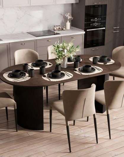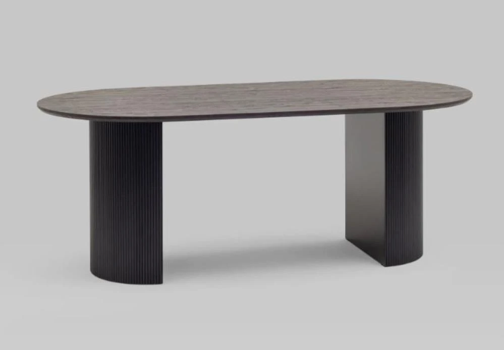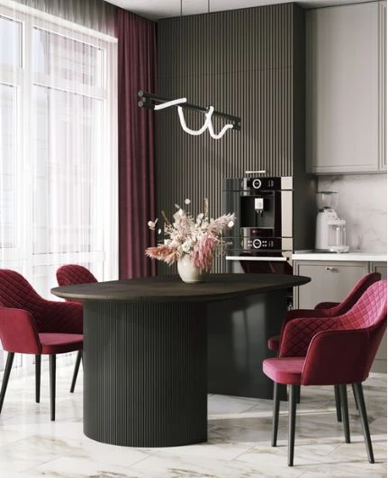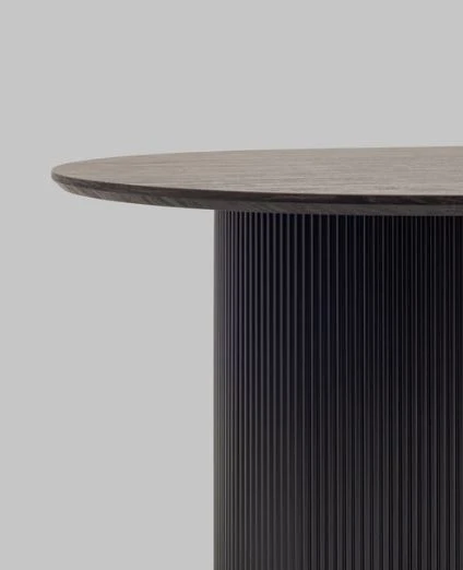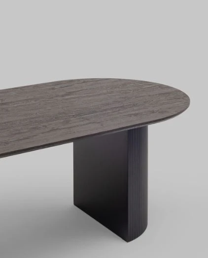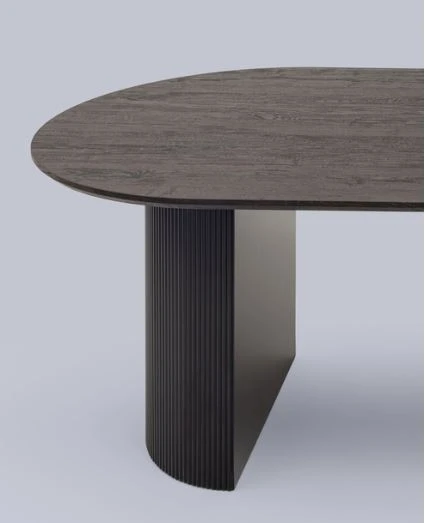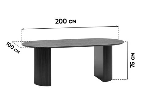 Столешница выполнена из прочного и долговечного МДФ. Темная поверхность столешницы гармонично сочетается с массивными ножками черного цвета. Простая овальная форма стола позволит легко вписать его в современный интерьер, стол украсит кухню, гостиную или современное кафе, ресторан. Опорные плиссированные ножки в лаконичном дизайне надёжно удерживают всю конструкцию и дополняют монолитный образ.