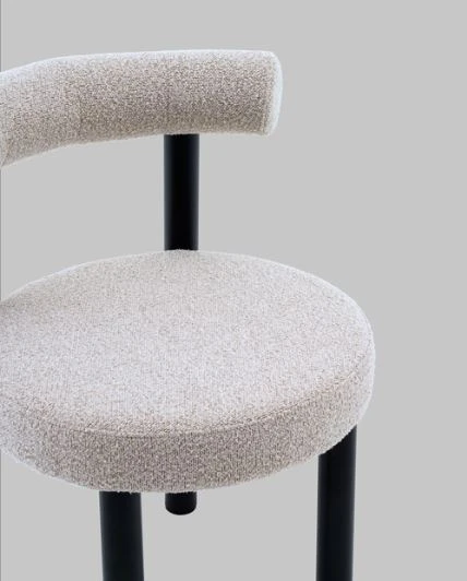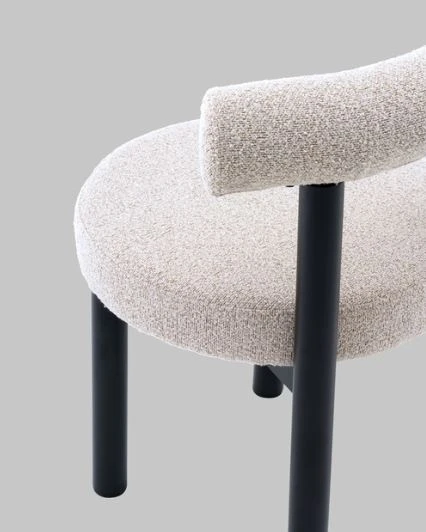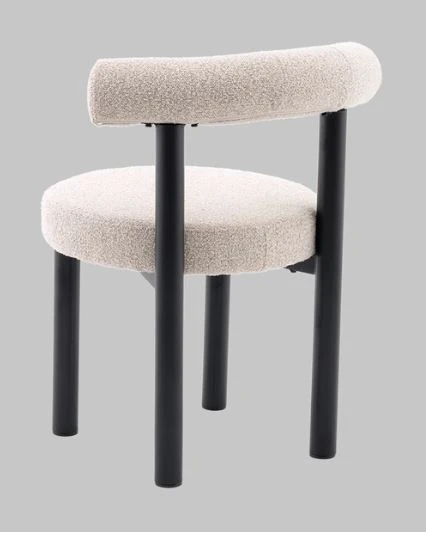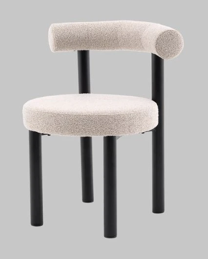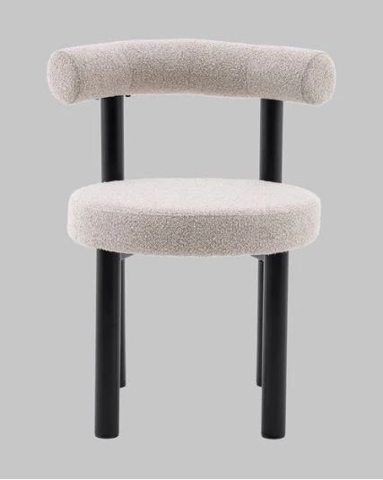 Материалы и цвета. Стул выполнен из высококачественного букле в бежевом цвете, который приятен на ощупь. Черный металлический каркас и ножки создают стильный контраст с мягкой обивкой, подчеркивая современный и минималистичный стиль. Комбинация этих материалов обеспечивает долговечность и привлекательный внешний вид.