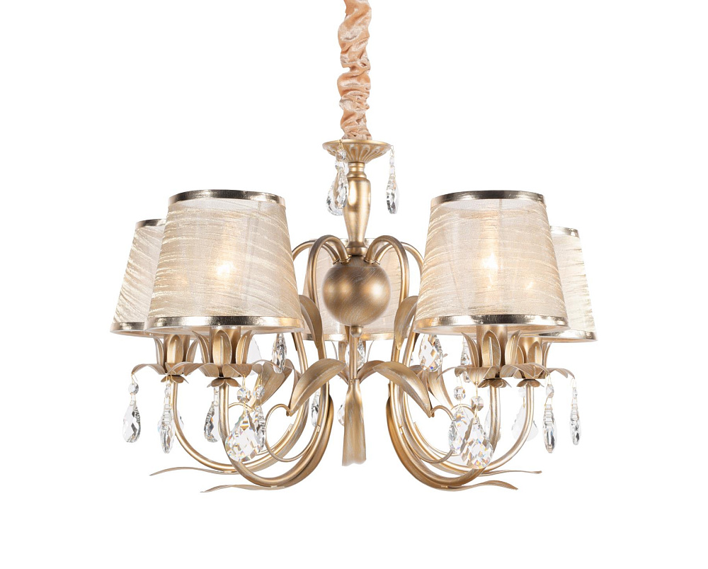 Роскошная люстра с абажурами на 5 рожков. Станет ярким элементом интерьеров в классическом стиле и в современной классике. Золото ярко играет на солнце, а хрусталики переливаются и создают эффект дисперсии. Плавные линии люстры дарят вам чувство гармонии и уюта. В серии также есть люстра на 7 ламп и бра — вместе они сделают ваш интерьер уникальным и неповторимым.