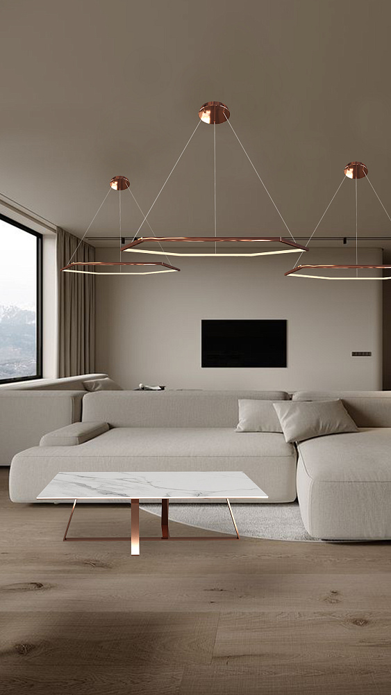 Светодиодная люстра в цвете розовое золото подойдет в гостиную, спальню или на кухню.
