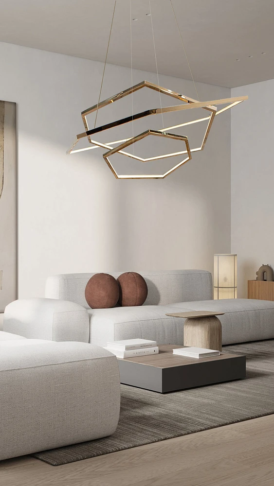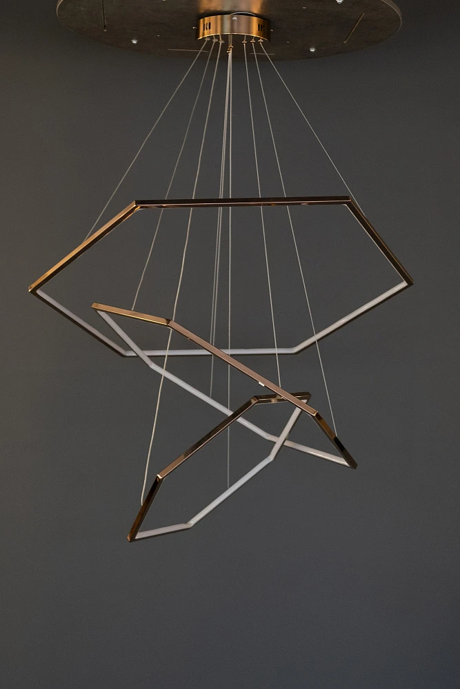 Эта люстра — трансформер. Можно соединить три модели разных диаметров в одну конструкцию. Либо разместить их поодиночке.