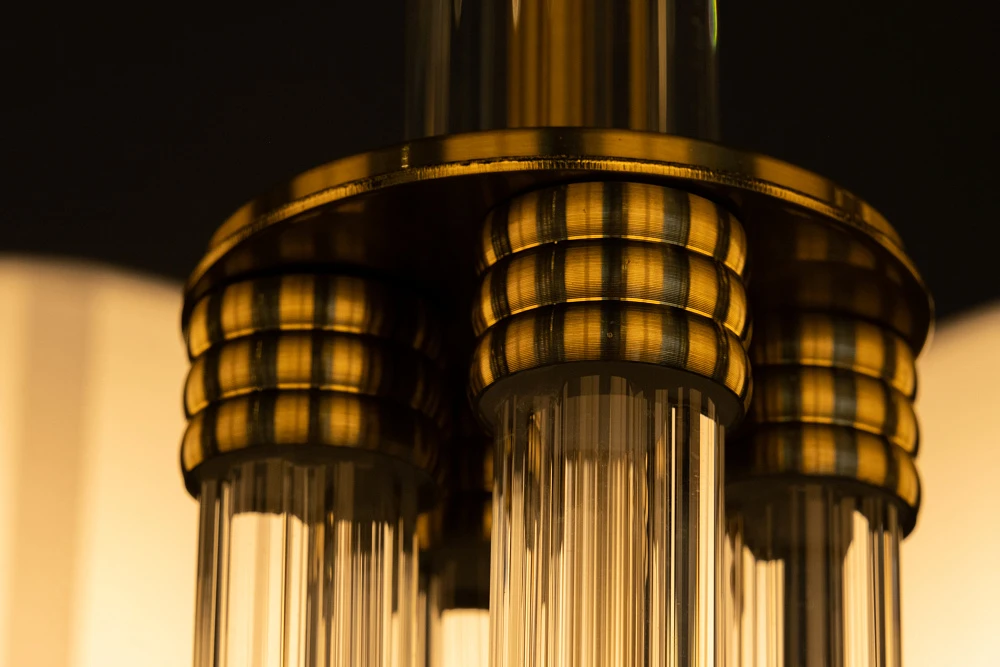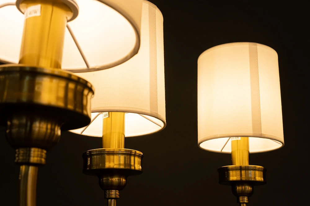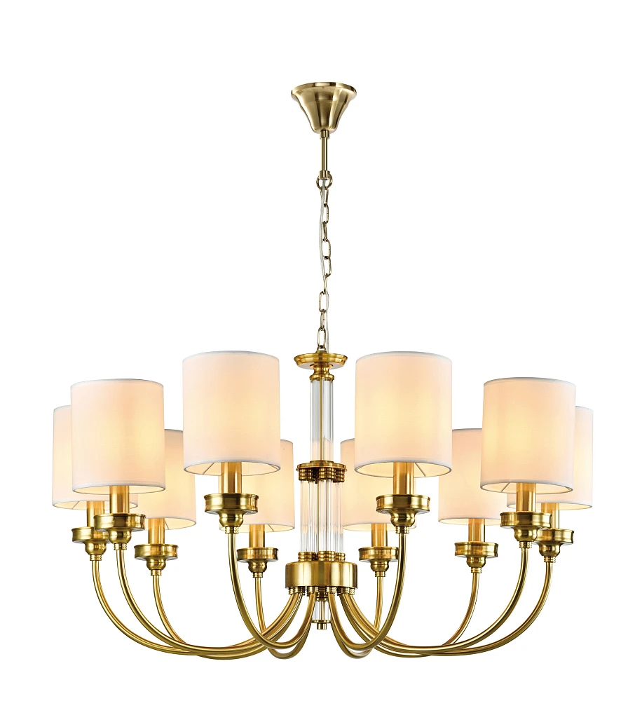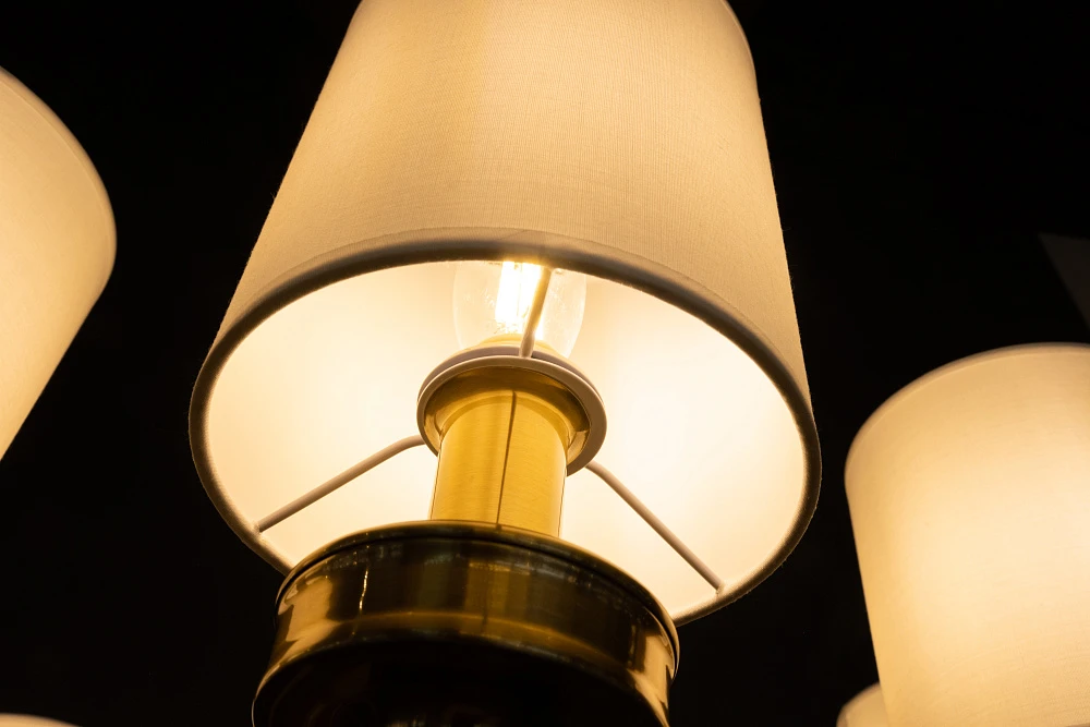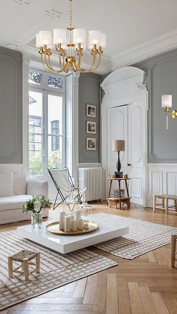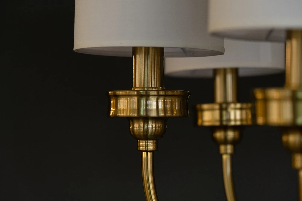 Элегантная люстра сочетает в себе теплый оттенок каркаса из золота и белых абажуров, создавая обновленный взгляд на классический вид.